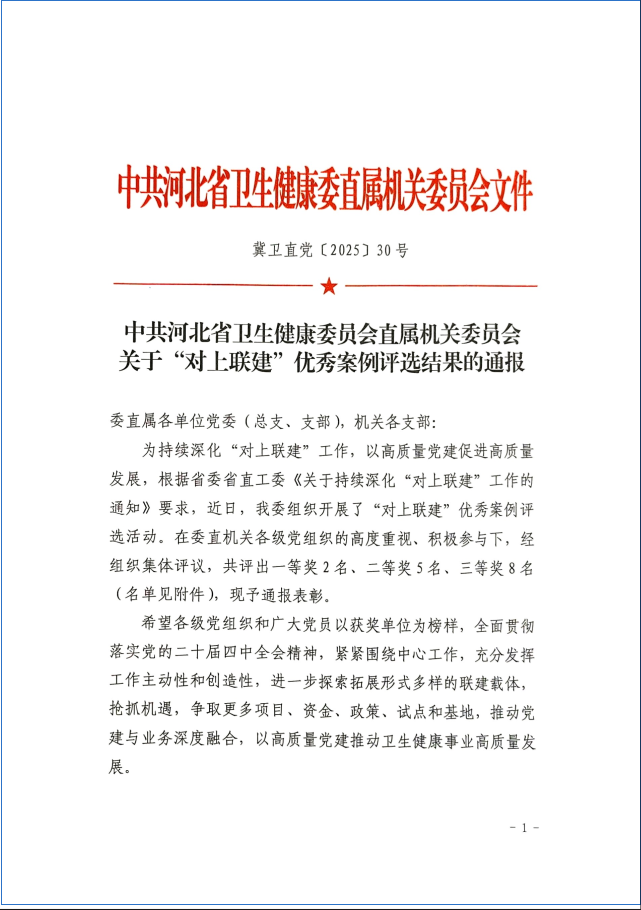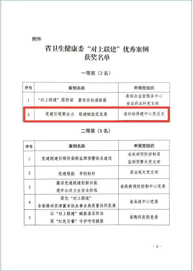 近日,省卫生健康委公布委属单位“对上联建”优秀案例评选结果,省妇幼保健中心党总支上报的“党建引领聚合力联建赋能促发展”案例荣获一等奖。这一荣誉既是对中心党建与业务深度融合成果的权威认可,也标志着我省妇幼健康领域“对上联建”工作迈入高质量发展新阶段。